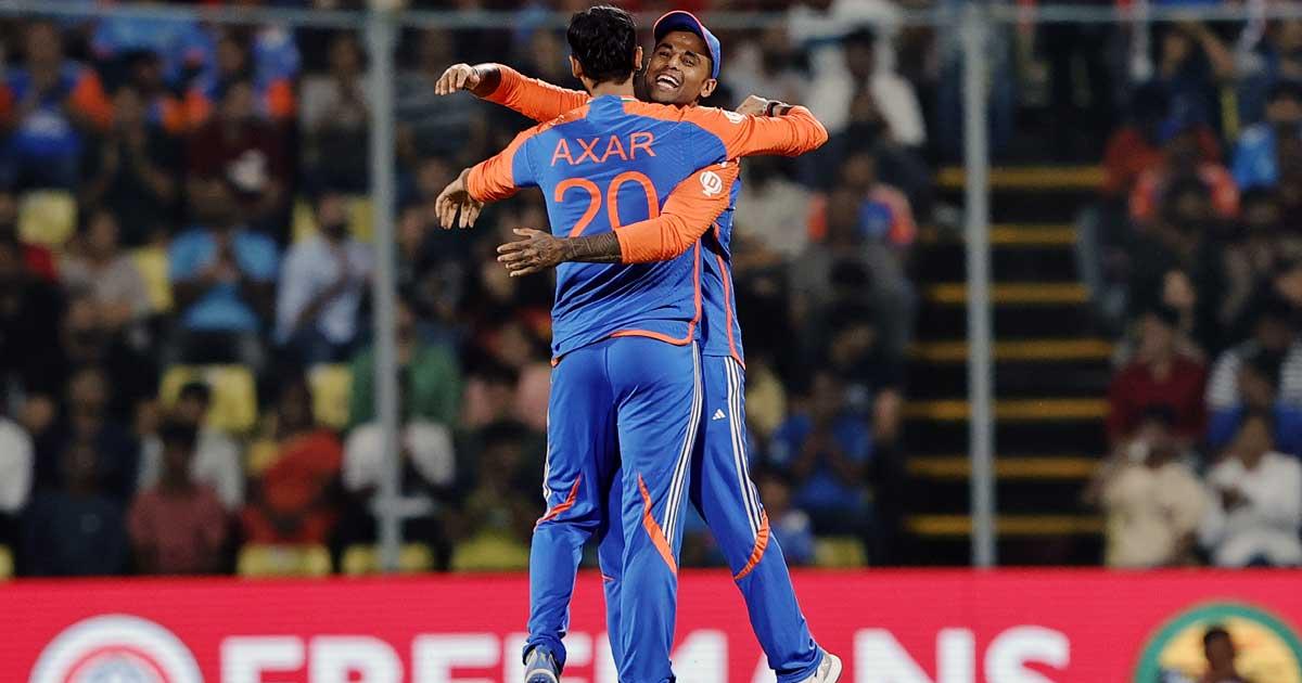 IMAGE: Captain Suryakumar Yadav hugs Axar Patel for taking Jos Buttler's wicket in the second T20I against England at the M A Chidambaram stadium, January 25, 2025. Photograph: BCCI
