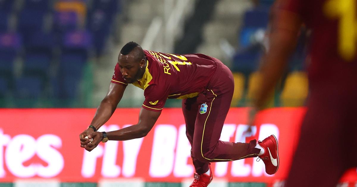 IMAGE: West Indies pacer Andre Russell takes a catch off his own bowling to dismiss Sri Lanka's Kusal Perera. Photograph: Francois Nel/Getty Images
