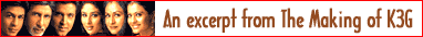 Kuch Kuch Hota Hai redefined the mechanics of filmmaking. And K3G has also been a landmark film in its own sense, with the star cast, the mounting and the mammoth budget. The success of Kabhi Khushi Kabhie Gham will only enhance its grandeur. Undoubtedly, it is the biggest film the industry has made till date. What kind of research did the project involve? It is a common belief that just because a film is a periodical, a mythological or a sci-fi thriller a lot of research goes into it. I thought the same way too until I wrote this book. But after putting my life on hold, travelling to London and Egypt and observing the entire shoot, I know that my earlier notion was a fallacy. Making a mainstream commercial film, blending varied popular tastes together and catering to every segment of your audience, is in itself a great talent.