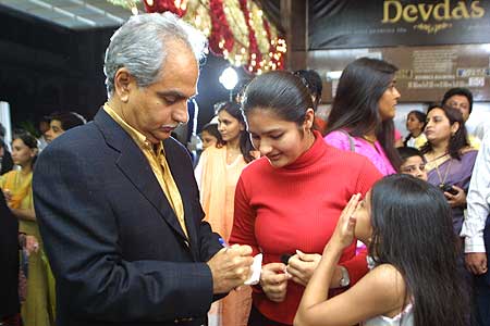 Ramesh Sippy, director of such blockbusters as Sholay (1975), signs autographs. Seen behind (in pink) is daughter, photographer Sheena, who is married to actor-filmmaker Shashi Kapoor's son Kunal.