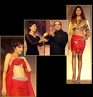 Jessae Randhawa, one of India's hottest models has the audience swooning in a nifty red number. While Vidisha Pavate in a oriental skirt teamed with a gold top struts her stuff. In the centre is ex-Channel [V] veejay, former Miss India Canada and television presenter Ruby Bhatia who presents a trophy to designer Tarun Tahiliani.