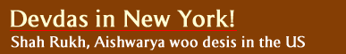 Shah Rukh Khan and Aishwarya Rai address a press conference at The Mark Hotel, New York. Posters of their latest film Devdas fill the background. The duo recently attended the Cannes Film Festival, where Devdas won rave reviews. Madhuri Dixit-Nene and Jackie Shroff, also starring in the film, were conspicuous by their absence in Cannes as well as in New York. Director Sanjay Leela Bhansali did not attend the New York press conference. Next