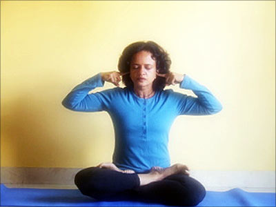 Sit up straight in any meditative pose. Shut your eyes and place the index finger of each hand in the respective ear to plug it.