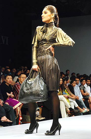 The inspiration for her line, which falls under the 'Contemporary' category, is Metallic Luxe, a throwback to the glam fashion of the '80s. Seen here is a metallic blouse teamed with pleated baloon skirt and trendy accessories.