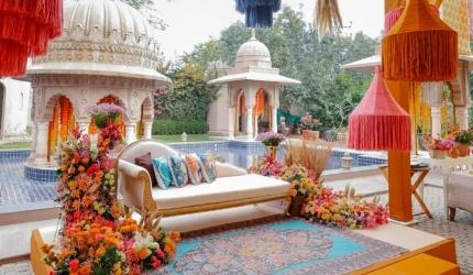 Drawing inspiration from the Mughal and Raj eras, a strong trend among couples, her decor is a visual treat -- imagine forts, princess courtyards, pink elephant sculptures to guide guests to the entrance, hand-blocked motifs of parrots, chintz and pomegranate in pale pinks and cardamom green, and pastel drapes.