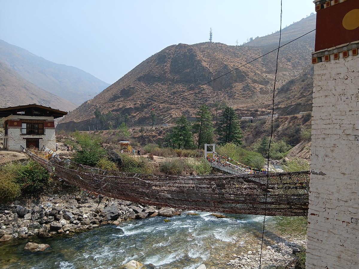From Paro, where the airport is located, a drive to the capital, Thimphu, requires a stop to admire the historic Tachogang Lhakhang bridge, an iron chain suspension bridge connecting the Tachog Lhakhang temple on one side and the other side of the Pa Chhu river.
