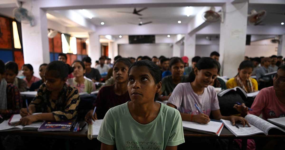 Students attend a class at Super Climax Academy, a coaching institute in Prayagraj, Uttar Pradesh, June 21, 2024, training students to prepare for competitive examinations to secure government jobs. Photograph: Sahiba Chawdhary/Reuters
