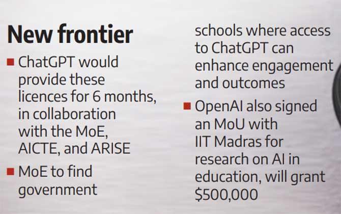 OpenAI will provide 500,000 free ChatGPT licences for six months to students and teachers across government schools from Classes 1 to 12, engineering and technical institutes, as well as K-12 educators.