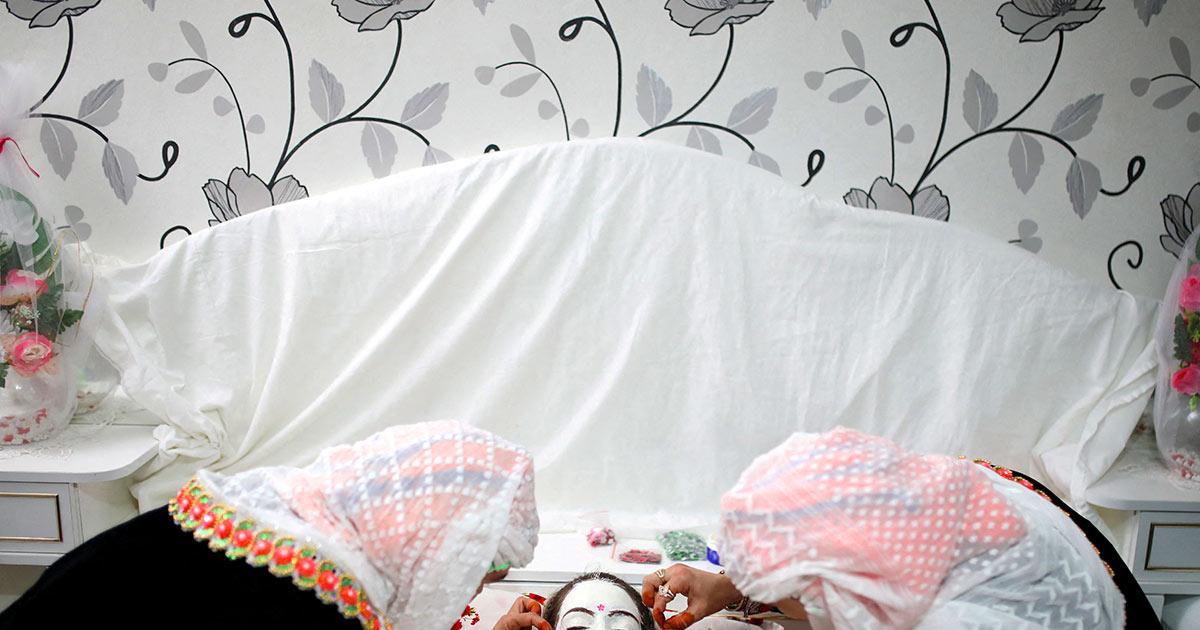 The highlight of the ceremony is the painting of the bride's face, where in a private rite open only to female in-laws, her face is covered in thick, chalky white paint and decorated with colourful sequins.