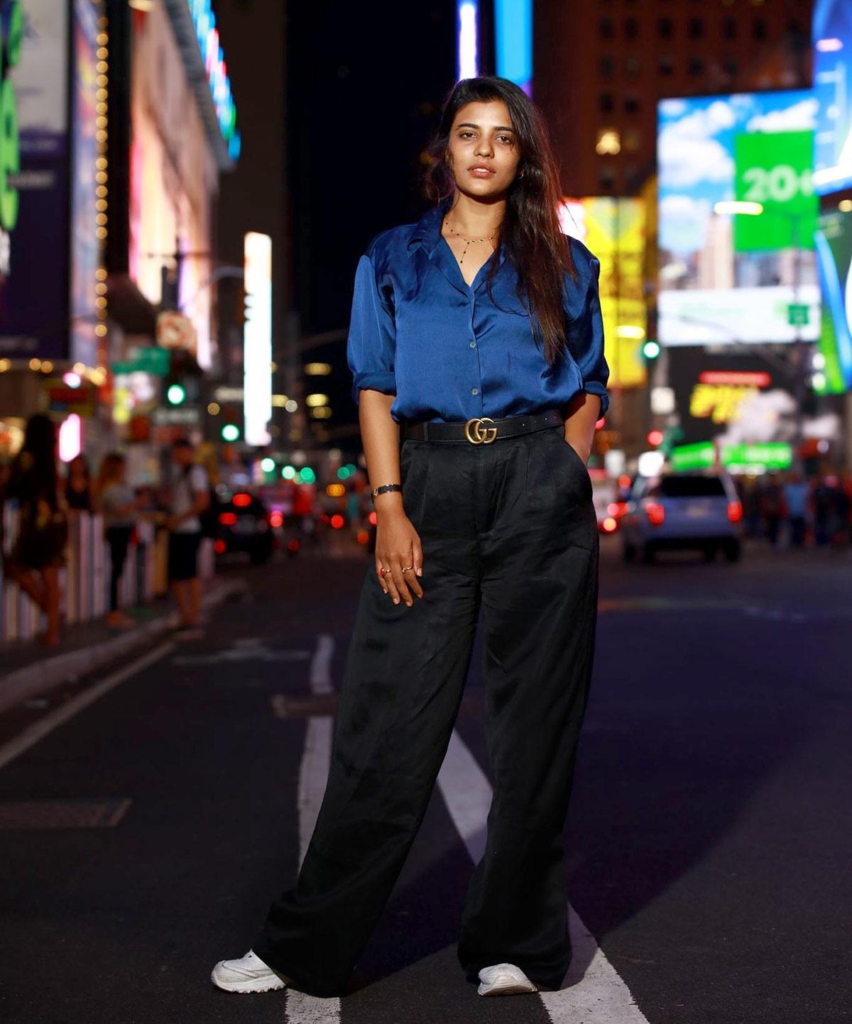 IMAGE: Aishwarya takes on NYC in a satin blue shirt, black trousers and a Gucci belt, turning a classic formal look into street style wear. All photographs: Kind courtesy Aishwarya Rajesh/Instagram