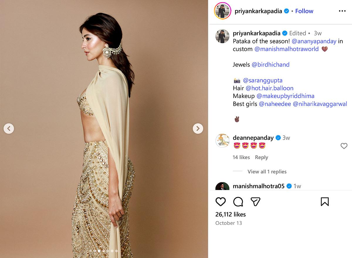 IMAGE: Ananya Panday adds a modern sparkle with a diamond kanauti that goes well with her gold-embellished Indo-western outfit. Photograph: Kind courtesy Ananya Panday/Instagram
