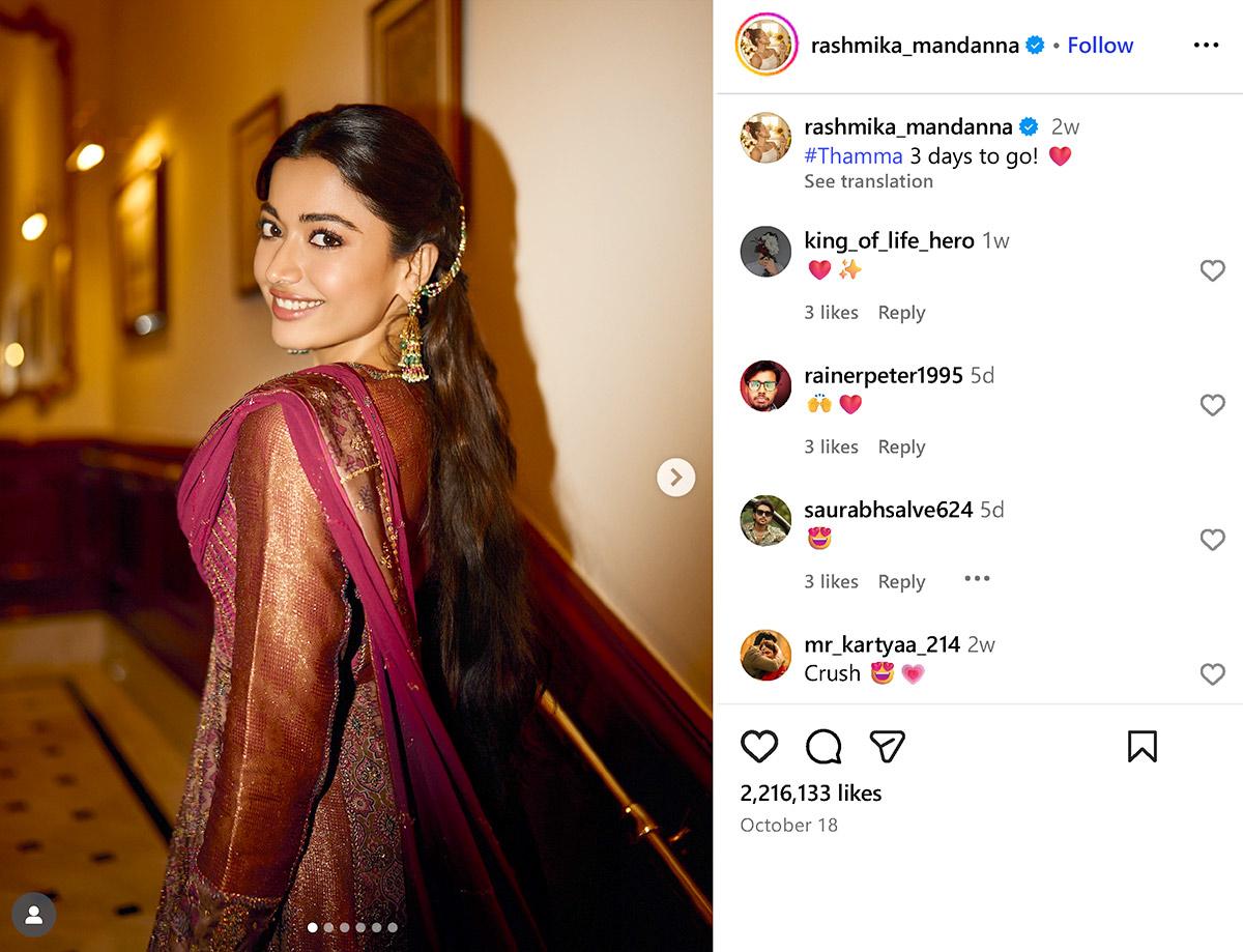 IMAGE: Rashmika Mandanna wears a vibrant multicoloured kanauti with jhumkas and a classic salwar suit. It is the exact vibe every girl with long hair should steal this festive season. Photograph: Kind courtesy Rashmika Mandanna/Instagram