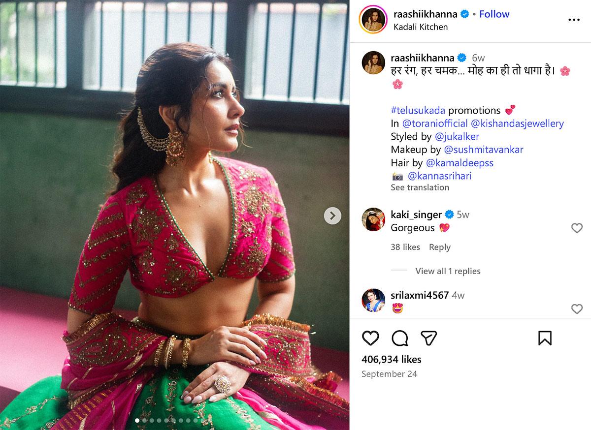 IMAGE: Raashii Khanna elevates her lehenga with a three-layered kanauti teamed with statement earrings. Her soft waves add a romantic touch, lending the whole look an undeniable freshness. Photograph: Kind courtesy Raashii Khanna/Instagram