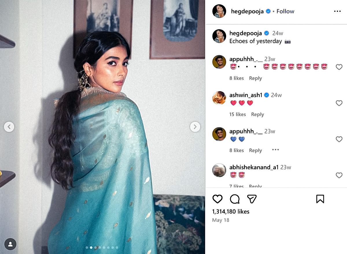 IMAGE: Pooja Hegde pairs her blue silk sari with a layered kanauti. Her soft waves balance the look beautifully, making her accessory stand out. Photograph: Kind courtesy Pooja Hegde/Instagram