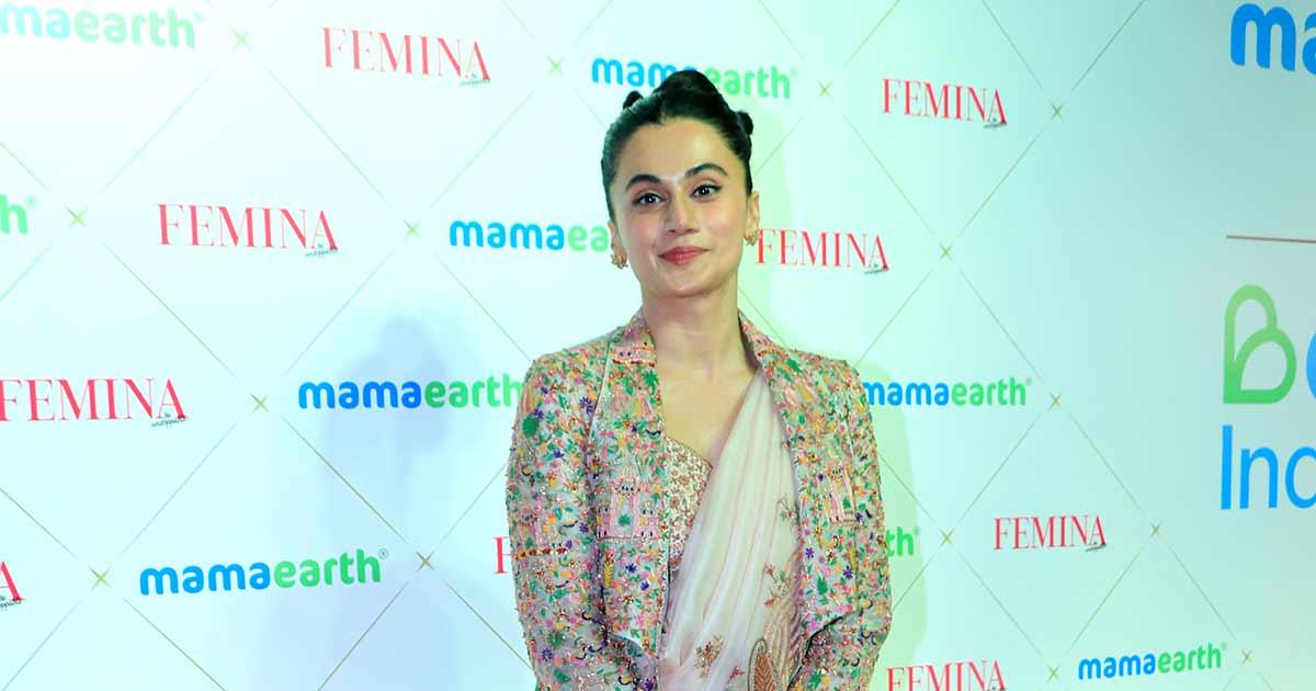 IMAGE: All eyes were on Taapsee Pannu who looked radiant in an ivory sari, paired with a floor-length embroidered jacket.
