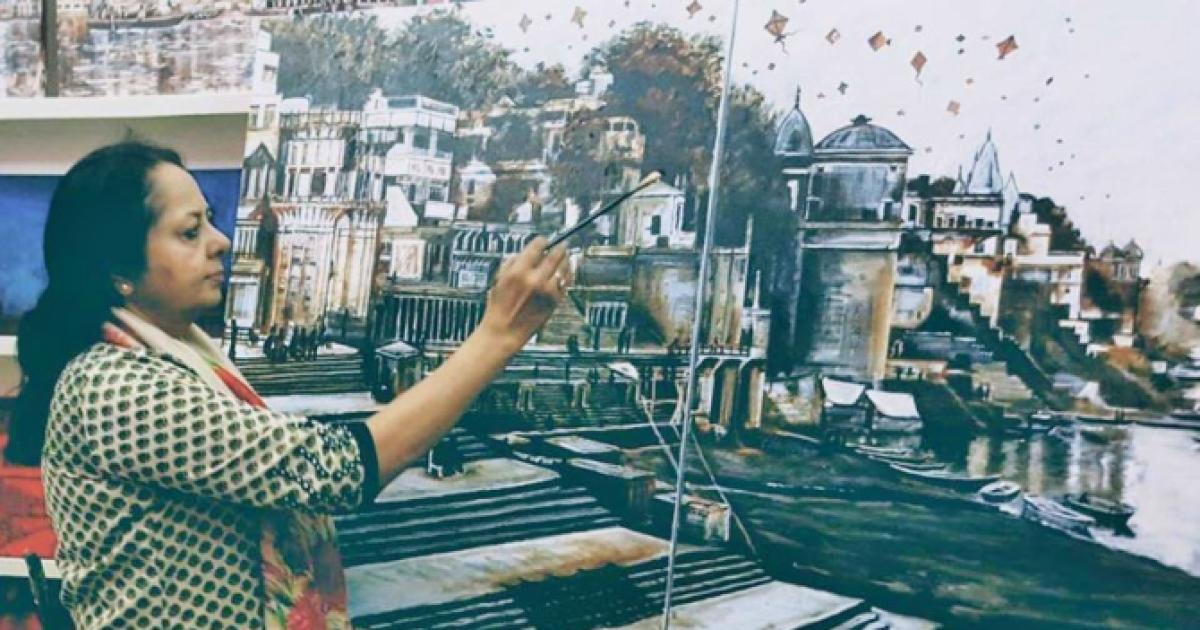 By juxtaposing the open terraced buildings with the spires of temples that overwhelm Benares, artist Mamta Malhotra brings to life the chaotic flavours of the holy city on canvas in her painting -- 'Neelkanth Nagri'.