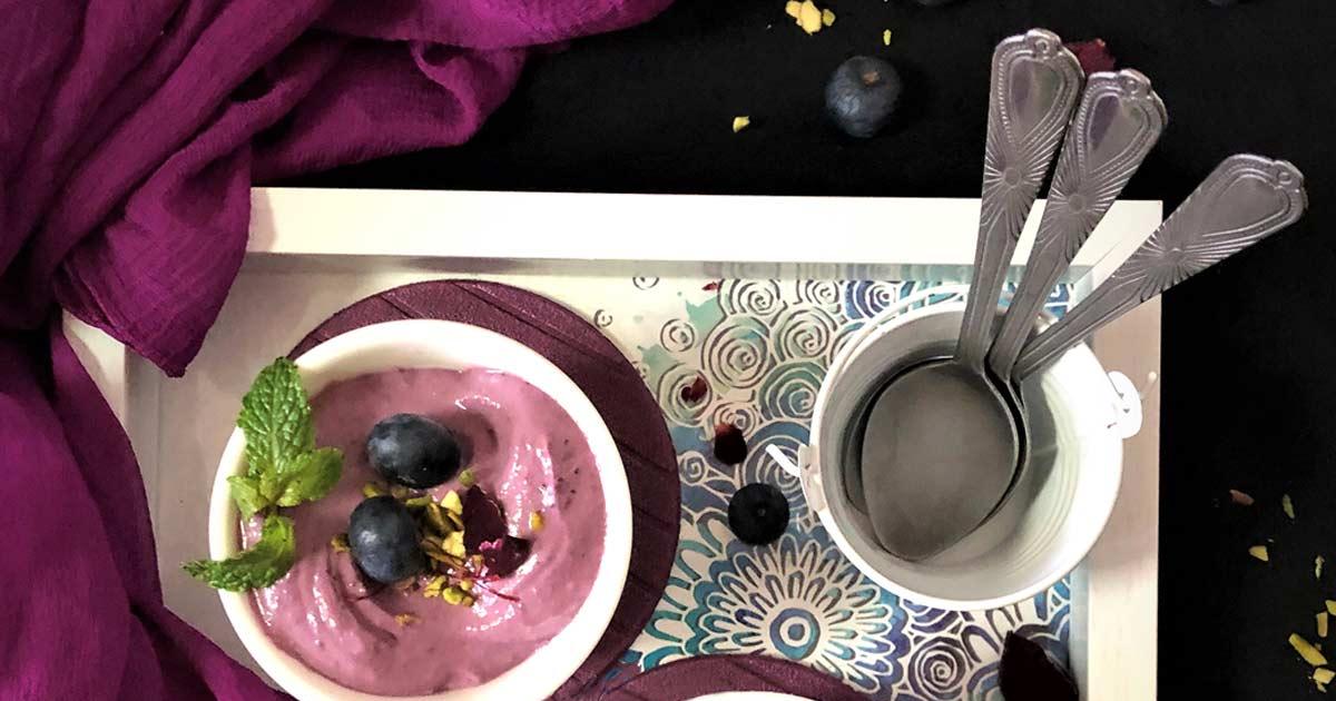 Bethica Das's Blueberry Shrikhand is made with low-fat yoghurt and garnished with chopped nuts, saffron and dry rose petals.