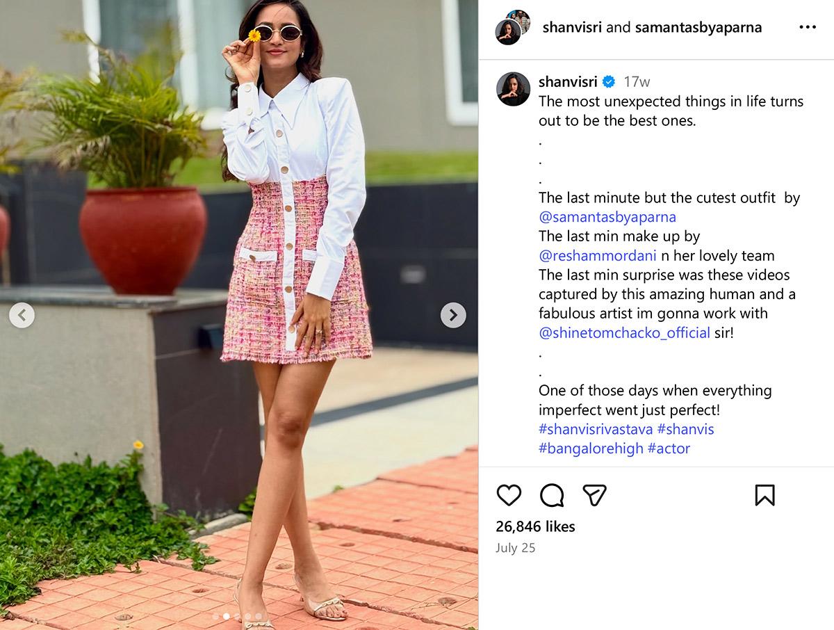 IMAGE: In a shirt-style dress with pink tweed, Shanvi mixes preppy and playful in the most effortless way. It’s that cute, coffee-date-to-shopping kind of look.