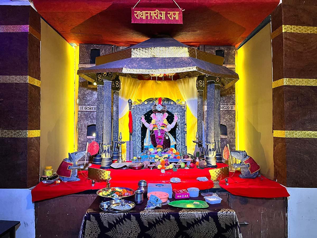 Shubham also shares this picture of the Lord Ganesha installed in his society; the decor takes inspiration from Chhatrapati Shivaji Maharaj Meghdambari (the decorative, domed canopy that houses Shivaji Maharaj's statue).