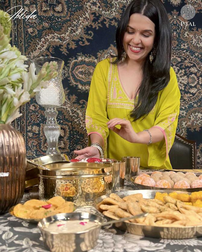 A buttery-soft Ajrakh modal fabric will form the base of the dining table setup, which will be piled with regional sweets and homemade savouries.
