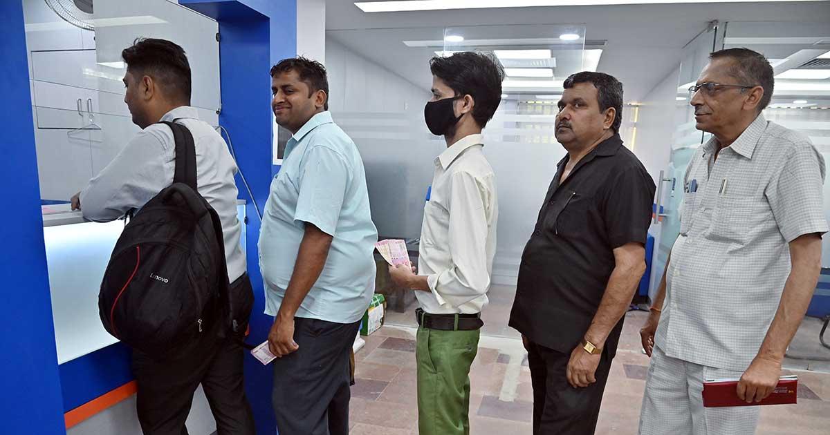 People wait in a queue at a bank in New Delhi. Photograph: Sanjay Sharma/ANI Photo