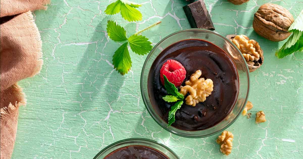Then add the remaining chocolate mixture on top of the fruity layer and refrigerate. - In a small frying pan, caramelise the walnut halves with a dash of agave/maple syrup or honey.