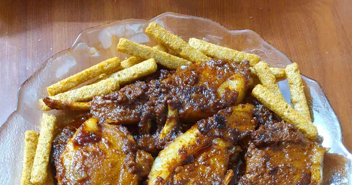 Grind to a smooth paste, use a little water if needed. - In a large bowl or container with a cover, marinate the pork chops with the ground paste.