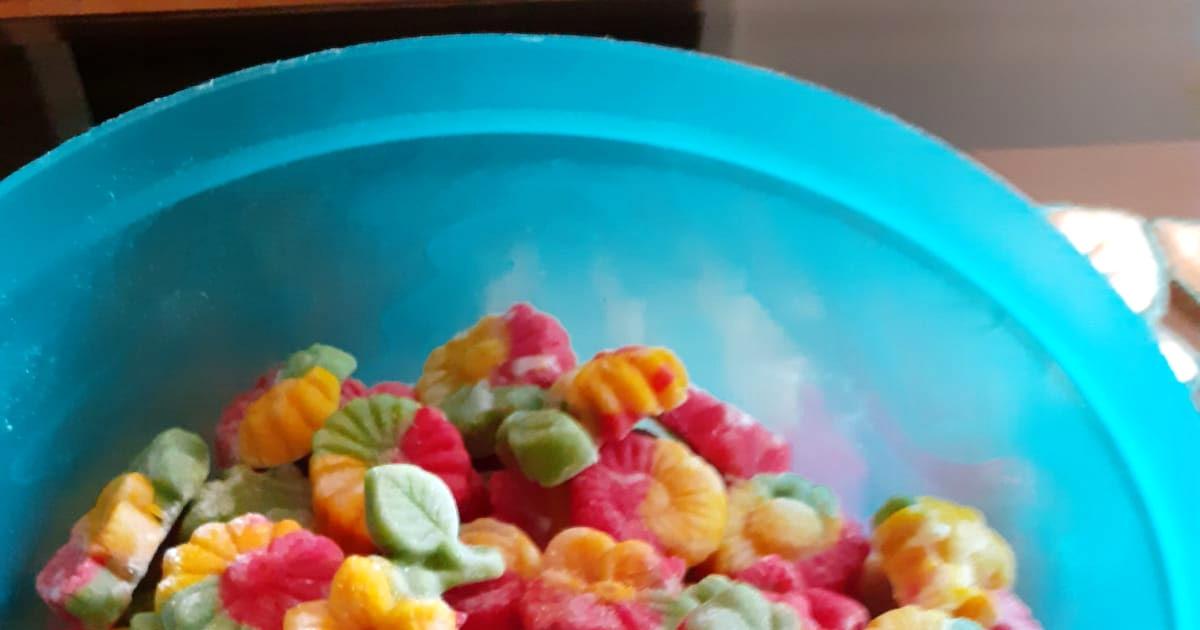 Dust the moulds with a little powdered sugar and press a little of each coloured portion or the same coloured portion into it.