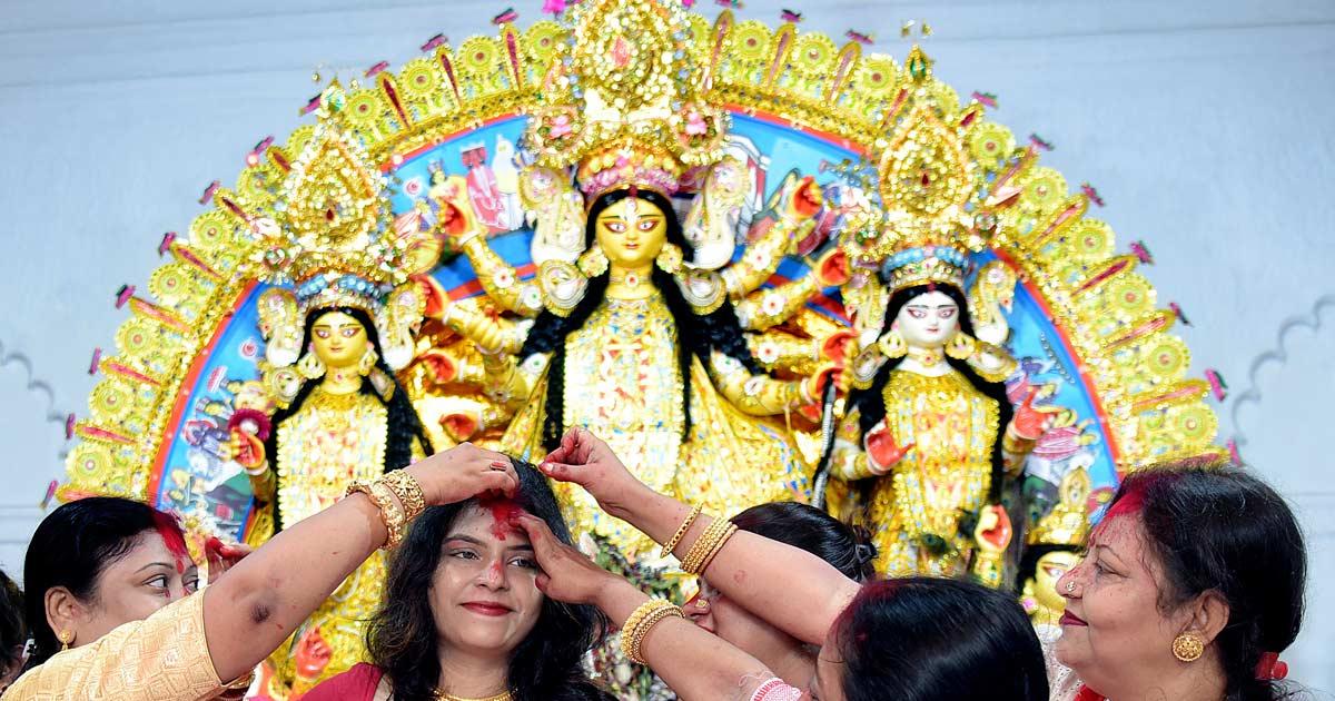 Among the last few ceremonies celebrated with her is the Sindoor Khela where married women apply sindoor on Her forehead and at Her feet.