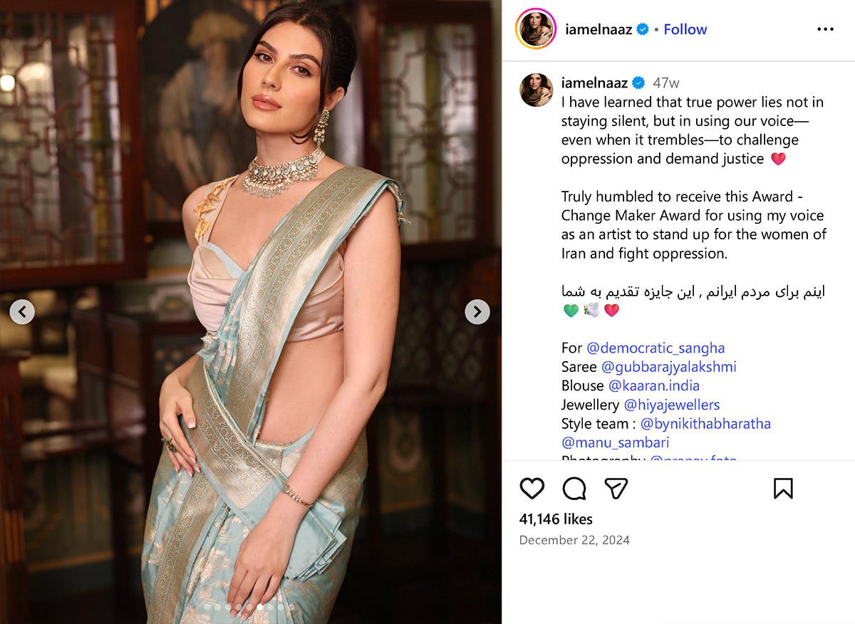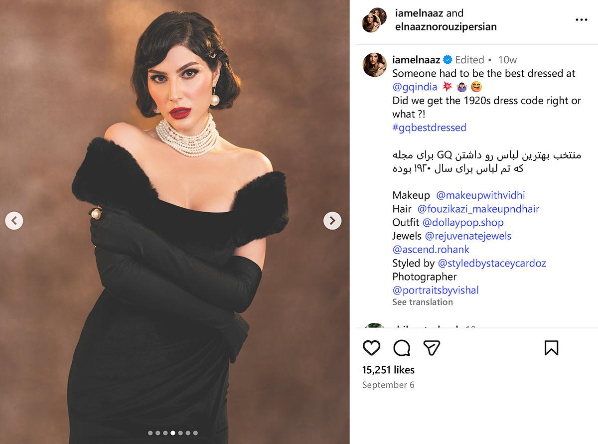 IMAGE: Even Elnaaz’s makeup lives in full shimmer mode, with highlighter that hits the light just right and glossy lips that make a statement.