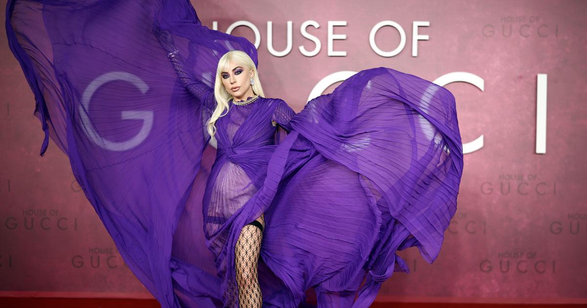 Lady Gaga made a splash in a violet cape gown as she returned to the red carpet at the UK premiere of House of Gucci.