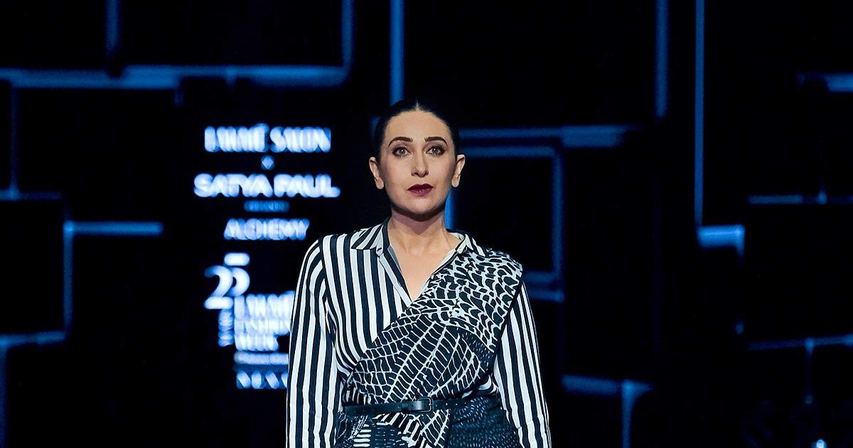 Karisma Kapoor makes a strong case for everyday glam in this modern printed sari she wore as the showstopper for Lakme Salon x Satya Paul's Alchemy show.
