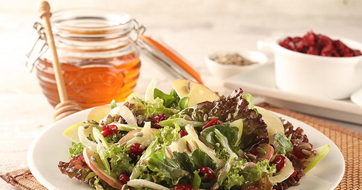 Perfect for this season, this salad is full of crisp sweet apple slices, mixed with fresh greens and the tangy dried cranberries offer the right amount of zing and crunch. The honey Dijon drizzle on top with sunflower seeds gives this refreshing salad the right finish.