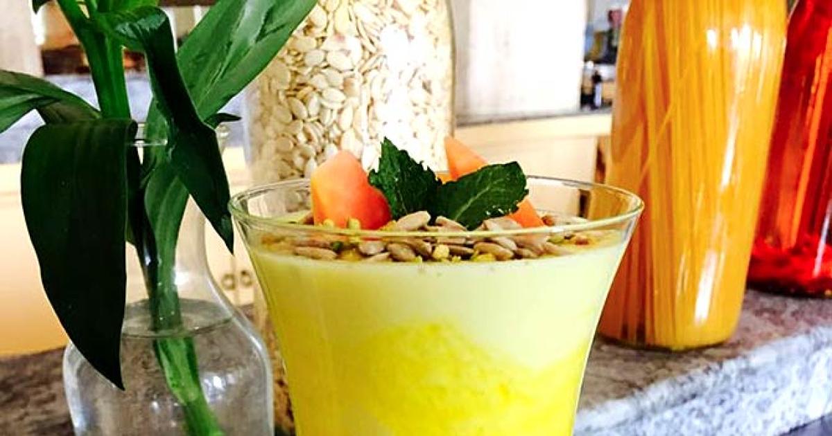 - Pour the blended mixture into a serving glass and chill for 30 minutes. Add a scoop of ice cream at the time of serving. At the base of the glass add arrak and pour the drink on top of it. Garnish with fresh rose petals.