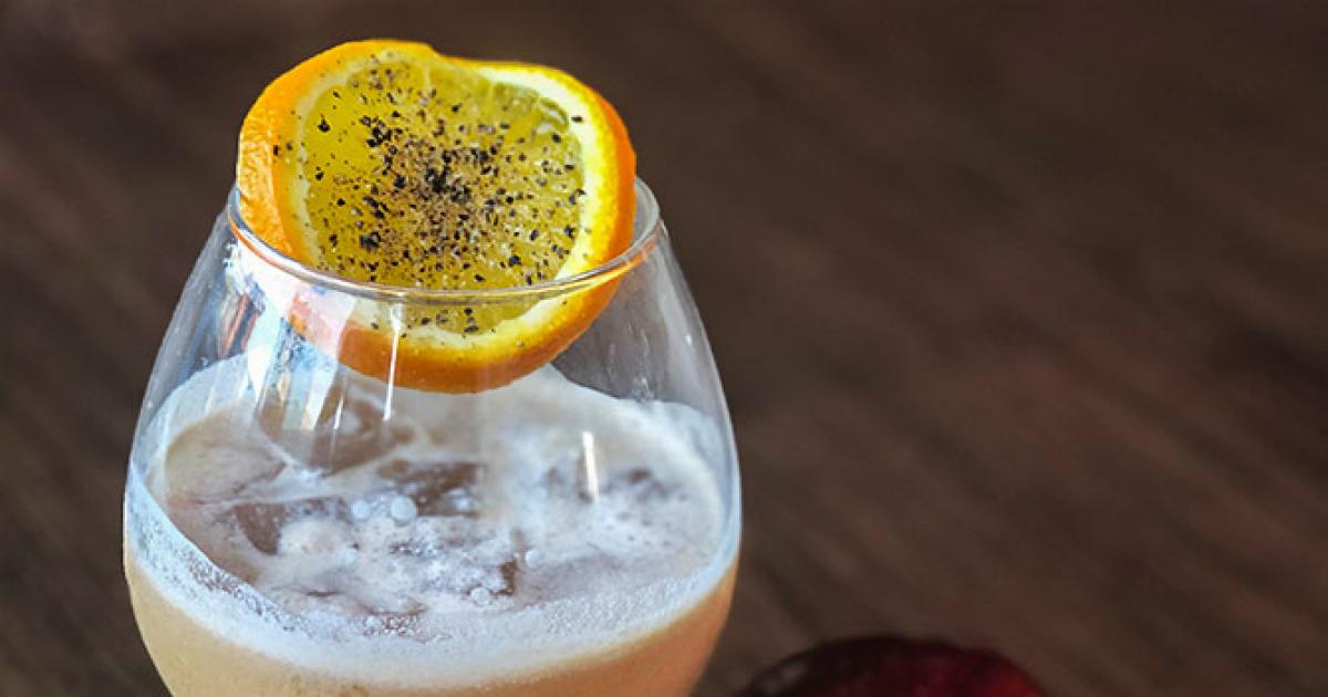 - Pour all ingredients into your shaker, shake and pour into a snifter with ice. Garnish with a lemon wheel blackened with pepper and cinnamon.