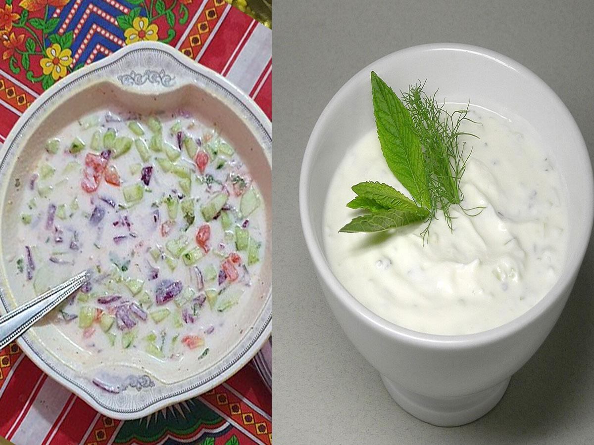 Indian raitas and the Greek tzatziki share ingredients -- yoghurt, herbs, and vegetables. Both are equally refreshing. Whether served with biryani or gyros, both succeed in cooling the palate and balancing spicy, rich meals.