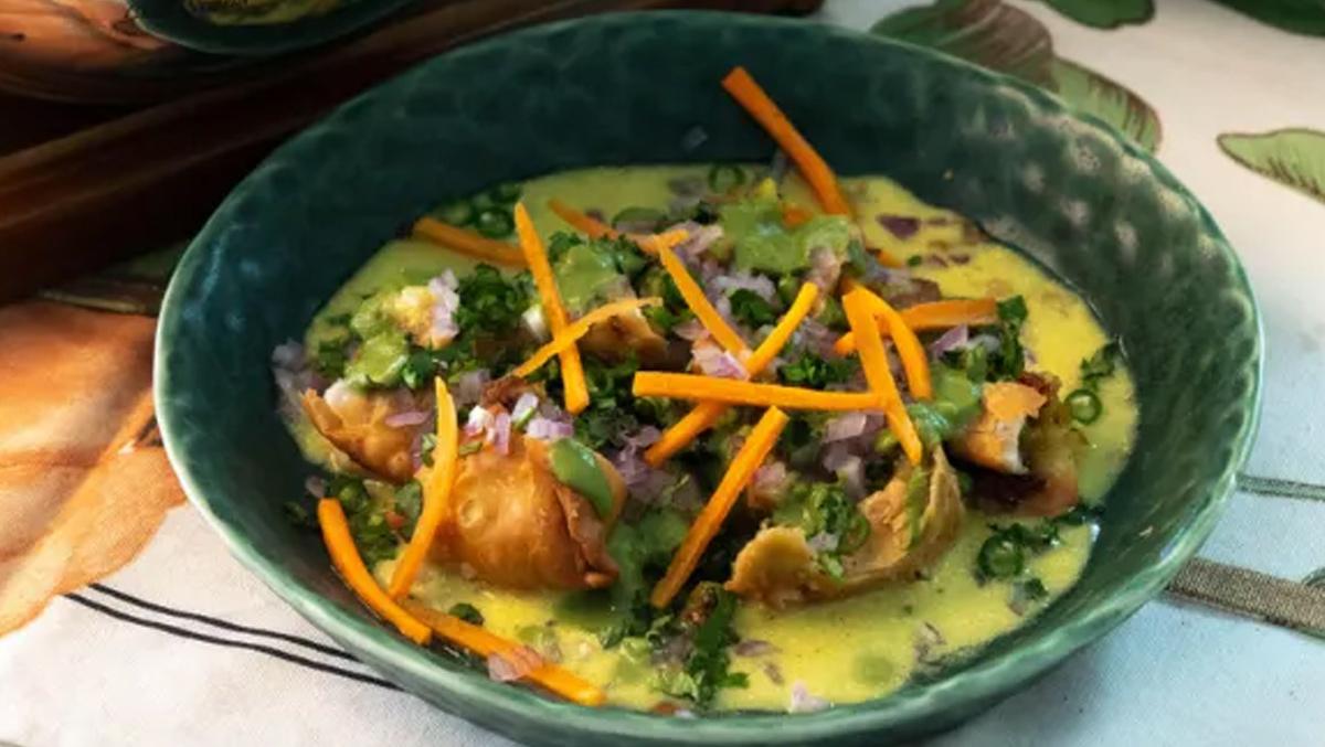 Crispy little samosas get a flavour makeover when dunked in a smooth, tangy besan kadhi, which is then garnished with onions, ginger, carrots. Recipe: Courtesy Chef Sneha Singhi.