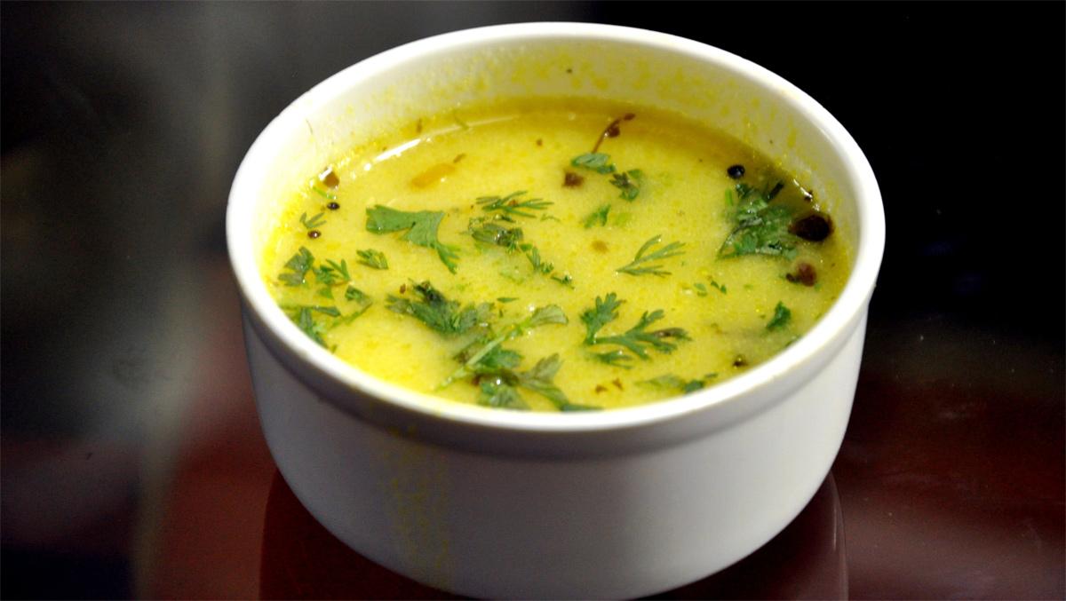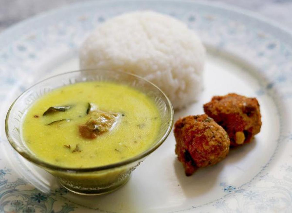 A yummy cross-regional creation by Sunita Harisinghani, she blends Mangalorean and Sindhi flavours and transforms the classic dahi kadhi into something new with the addition of crispy South Indian-style dal vadas made from chana dal and chopped onions.