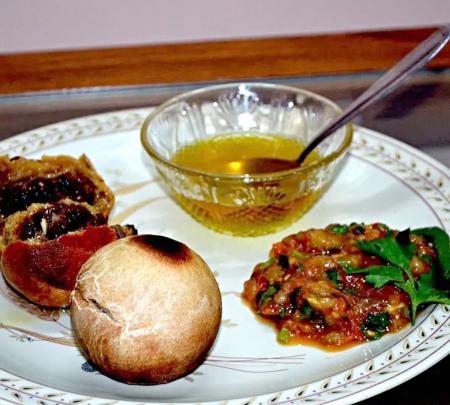 It's served with chokha, made from smoked vegetables, like eggplant or potatoes, that have been mashed with mustard oil. Stuffed red mirchi achaar might be served on the side.