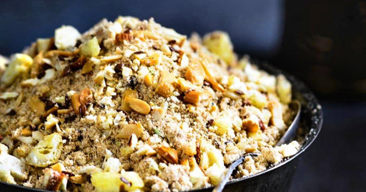 - Coarsely grind the wheat balls in a mixer. Add soft jaggery, cardamom powder, cashew nuts, almonds and raisins and mix. Serve churma with melted ghee.