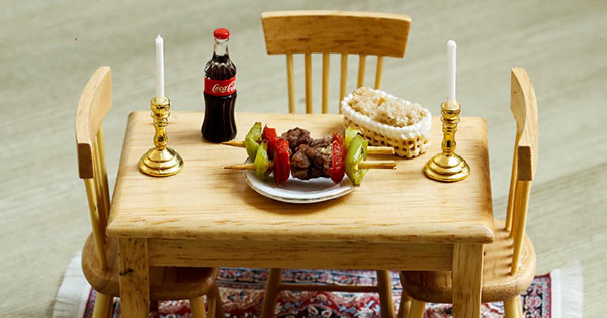 The table is set for three! The dining table has meat skewers, a bottle of Coca Cola and some bread.