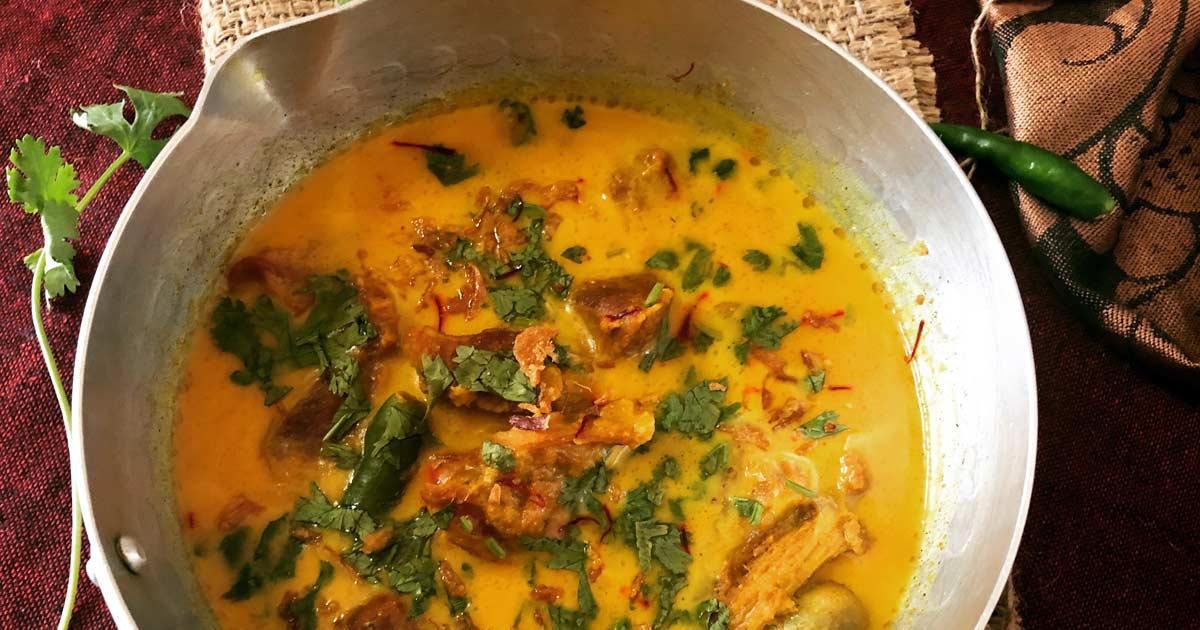 Bethica Das's Saffron Mutton Curry is cooked in milk, thickened with a paste of sesame seeds and flavoured with saffron, rose water and kewra.