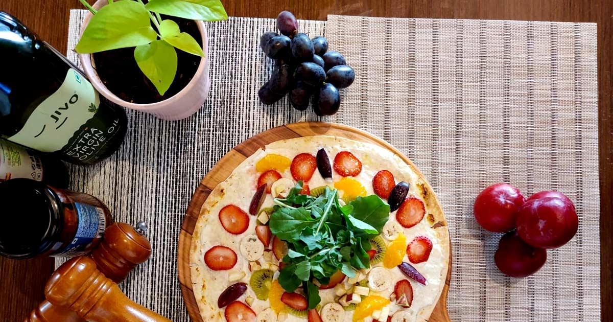 Creamy hung curd or Greek yoghurt replaces the tomato sauce, and an assortment of freshly sliced seasonal fruits make the topping.