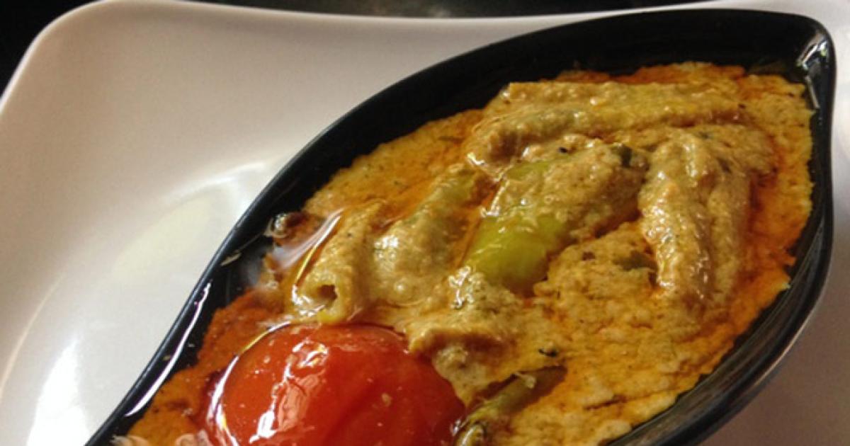 The Hyderabadi Mirchi ka Salan is a thick gravy made from a paste of roasted coconut, peanuts, sesame seeds, cumin seeds and mustard seeds.
