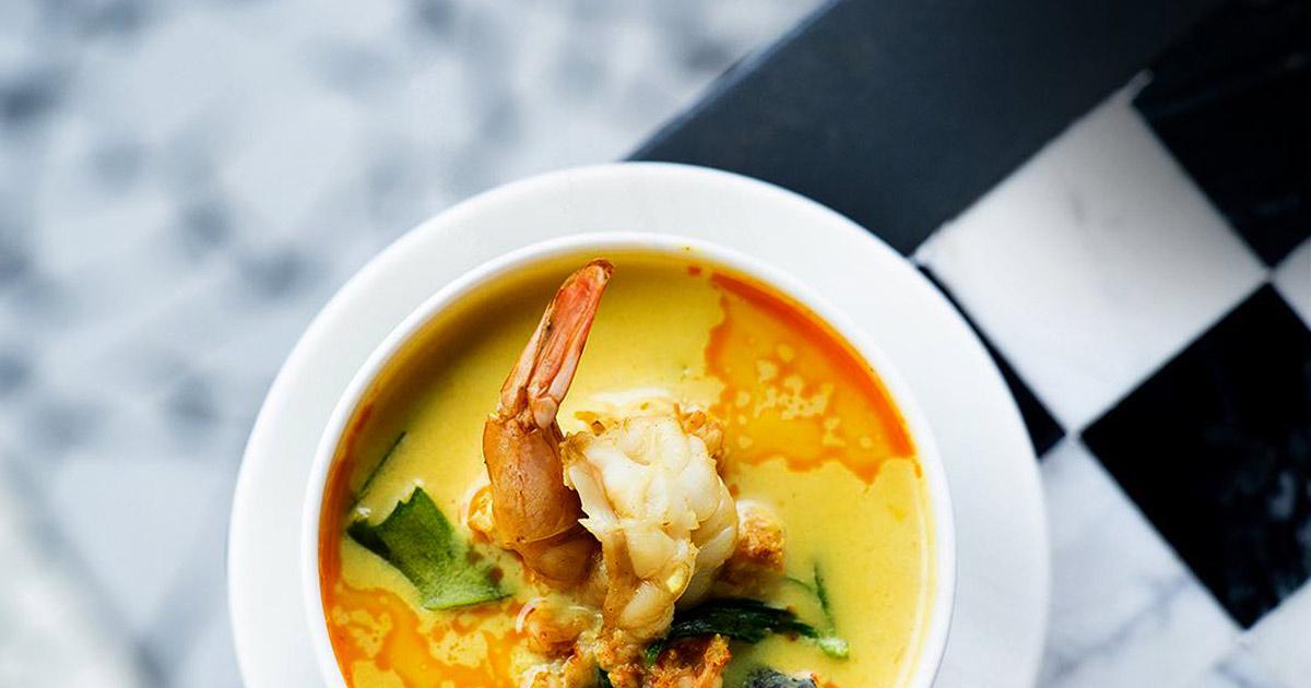 Let Chef Manoj Sharma bowl you over with his soothing, steaming bowl of Thai-style Shrimp, Coconut And Kaffir Lime Soup.
