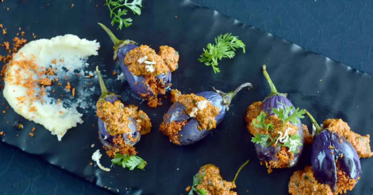 - Slit the brinjal into four parts. Take grated coconut, crushed peanut, jaggery, chilly, ginger, coriander and salt. Mix it and stuff it in the brinjal. Roast it in an oven.
