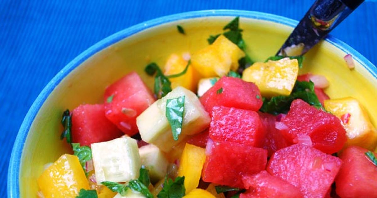 - Add in the cucumber, yellow bell pepper, salt, black pepper and watermelon cubes. Gently toss it up.