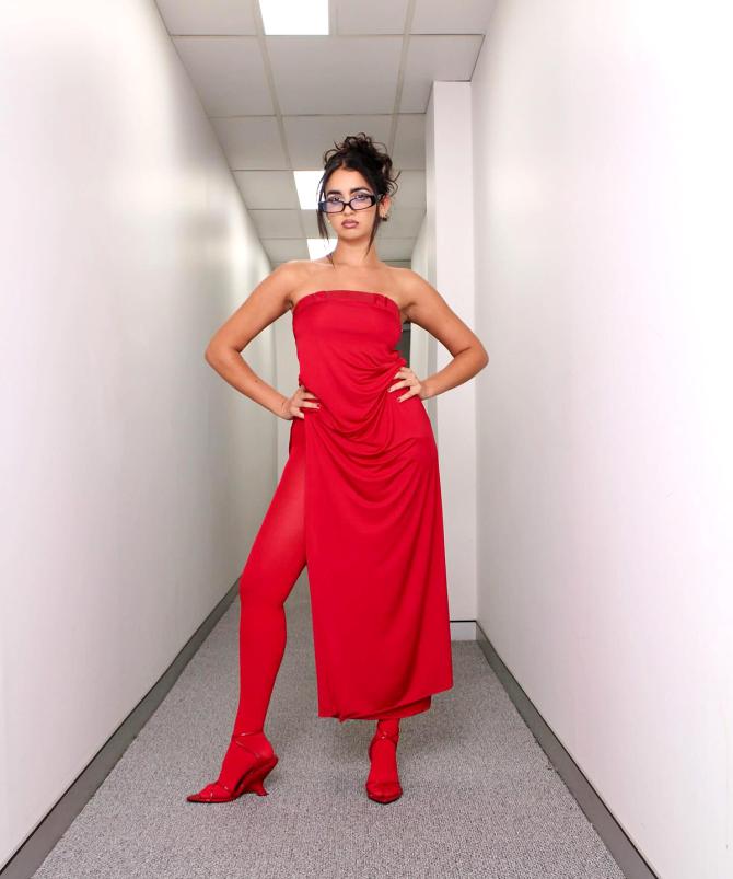 IMAGE: Geraldine is red-y to slay in this slit dress, stockings and heels. Not everyone can pull this off; she, though, makes it look easy! All photographs: Kind courtesy Geraldine Viswanathan/Instagram