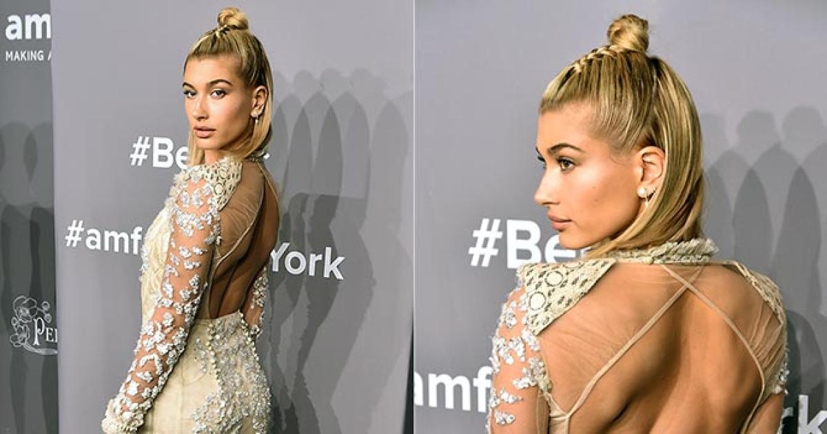 Hailey Baldwin wore an ivory Roberto Cavalli lace-detailed gown.