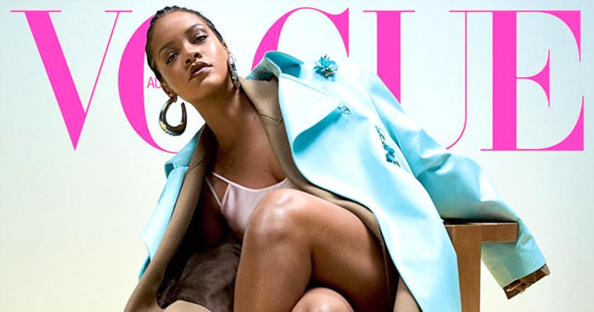 On the cover Rihanna wows in two jackets -- powder blue and tan brown -- as she nails the layered look.